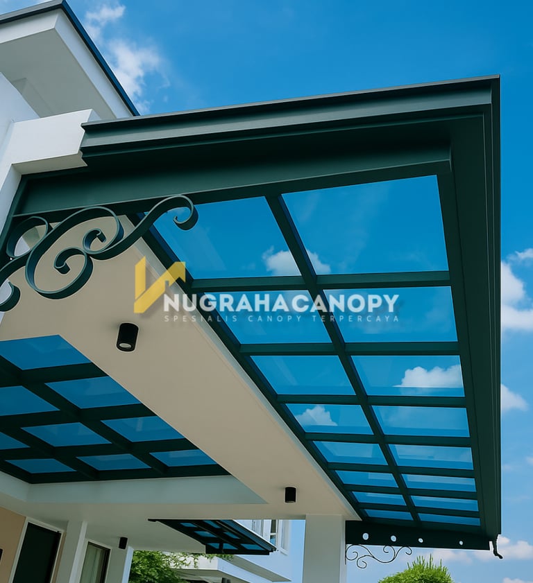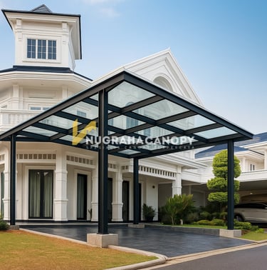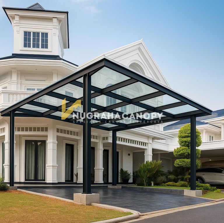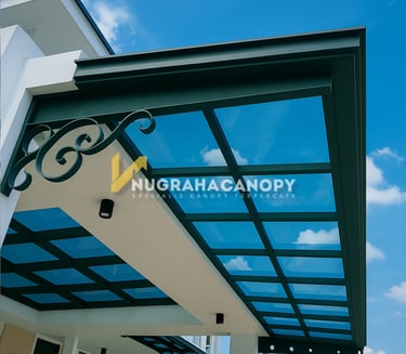 Kanopi kaca dengan desain modern dan kuat, cocok untuk hunian maupun bangunan komersial. Memberikan perlindungan tanpa mengurangi pencahayaan alami.